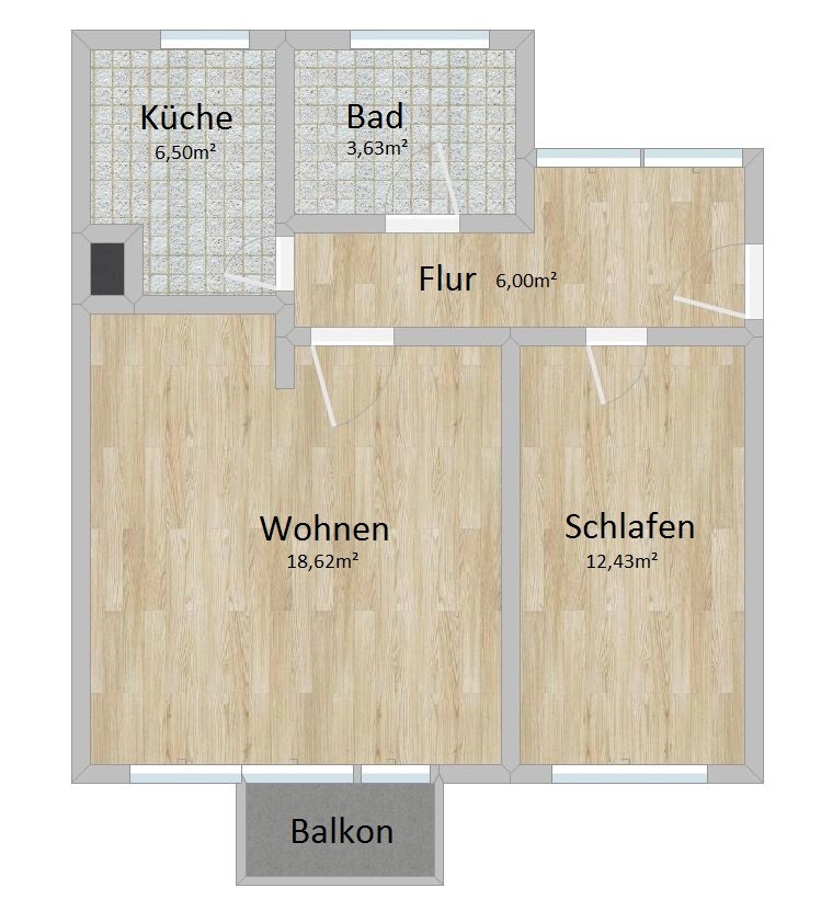 Die 2 Zimmer, Flur, Bad und Küche verteilen sich auf ca.53 m² mit vorteilhaftem Grundriss. Vom Wohnzimmer kommen Sie auf den Balkon in Westrichtung. Eine weitere Besonderheit der schönen Wohnung ist der Flur mit Tageslicht.